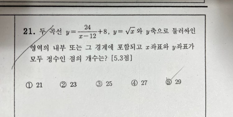 x가 1일 때: y는 √1 =1 부터 24/(1−12)+8=24/(-11)+8≈5.8까지 (5개: 1, 2, 3, 4, 5)